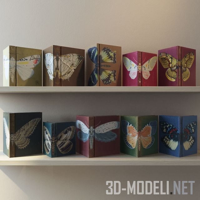 Модель для декора интерьера, набор, который состоит из десяти книг, с рисунками бабочек на обложке. Материалы и текстуры присутствуют.