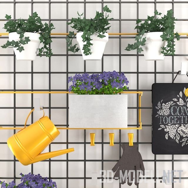 Комплект декоративных элементов, в который входят резиновые сапоги, дождевики, резиновые перчатки, лейка, растения и пр. Модель будет уместна в пространстве прихожей дома. Все текстуры есть.
