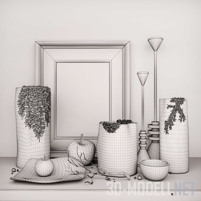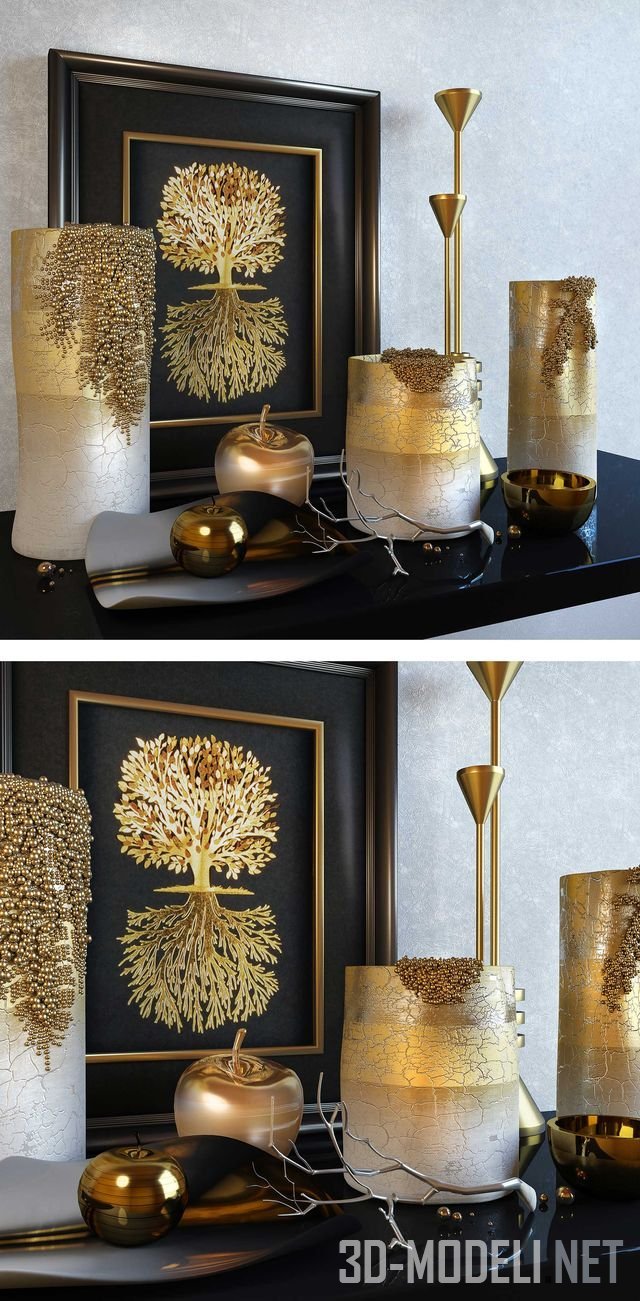 Элегантный и роскошный набор декоративных элементов, в отделке которых доминирует золото. В комплекте картина, три различных вазы, два яблока и два подсвечника, а также ветка, пиала, блюдо.