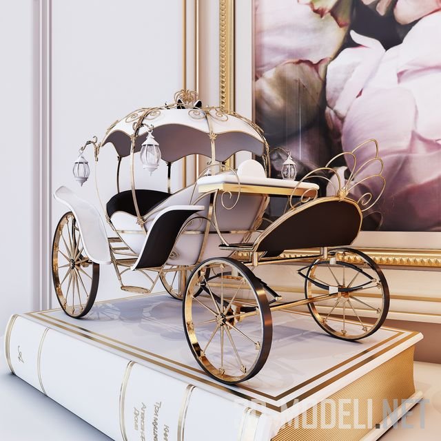 Классический декоративный набор, в который входит консоль с настольной лампой, книги, свечи, картина с пионами от Thomas Darnell. Изюминкой комплекта можно по праву считать миниатюрную декоративную карету.