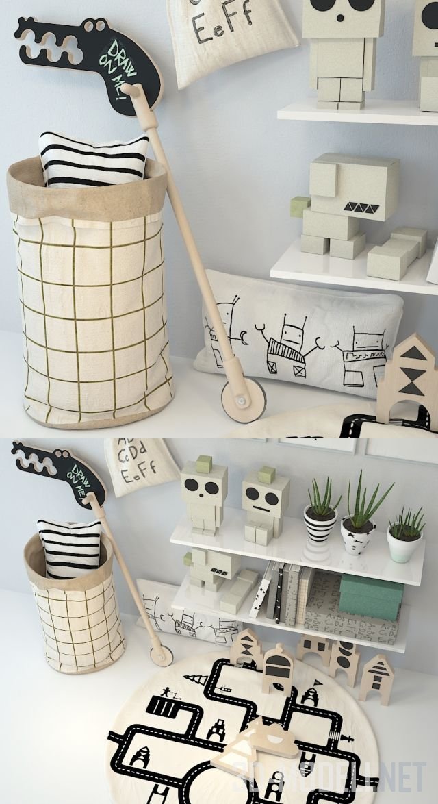 Набор предметов для дизайна интерьера комнаты подростка, Игровой ковер и набор игрушек ОТ ooh-noo. В комплекте фотоаппарат, полки с коробками и зелеными цветами в горшках, картинки на стене и пр.