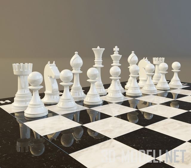 Раскрытая шахматная доска с белыми и черными фигурами из гранита и мрамора. Хорошо использовать модель для декора интерьера.