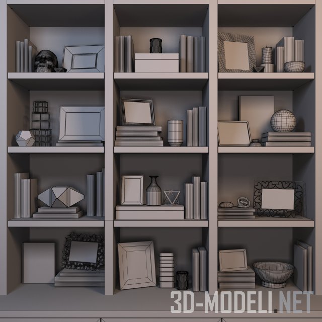 Большой стеллаж темно-синего цвета с тремя глубокими горизонтальными полками и двумя вертикальными, делящими его на двенадцать одинаковых отделений. Секции стеллажа заполнены разнообразным декором: книгами, фотографиями, вазочками и различными аксессуарами.