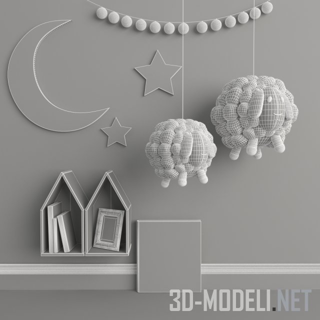Нежный набор для украшения комнаты малыша – подвесные игрушки-овечки, гирлянда, месяц и звездочки, удобные полки-домики из фанеры, а также альбом с надписью «Наше солнышко».