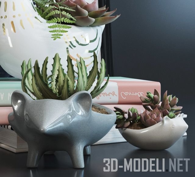 Декоративные цветочные горшки, выполненные в форме ежиков и курицы, являются основой этой оригинальной композиции для украшения интерьера. Ежей два, один побольше, другой поменьше. Все горшки с суккулентами. Тот, что в форме курочки, стоит на книгах. Картина в темной раме с паспарту служит хорошим фоном для растений.