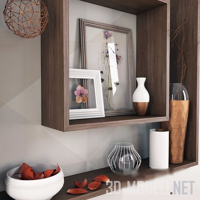 Интересная интерьерная композиция в виде двух квадратных полок, вставленных с интервалом одна в другую. Полки коричневого цвета с текстурой дерева. Во внутренней меньшей по размеру полке стоят две рамки с цветами на прозрачном фоне и небольшая ваза с бронзовой нижней частью и белой верхней.