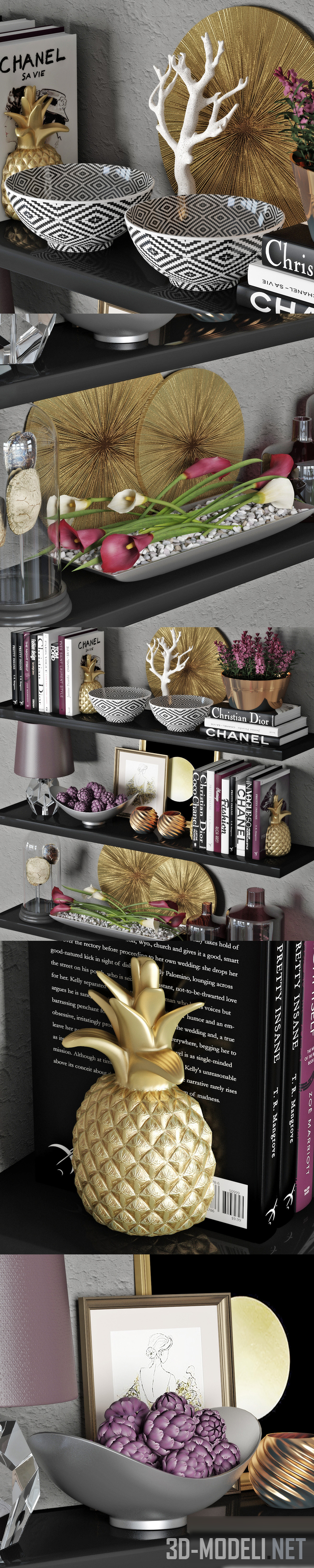 Три темные лакированные полки, на которых стоят книги, зажатые декоративными половинками золотых ананасов, золотистые диски, две черно-белые широкие вазы с геометрическим рисунком, настольная лампа с граненым стеклянным основанием и лиловым абажуром, красными цветами в медной широкой вазе и другие декоративные предметы.