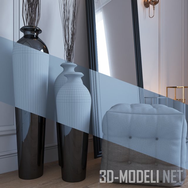 Декоративный сет с напольным зеркалом Eastbourne в черной раме, размеры: высота 2200 мм, ширина 800 мм, белыми свечами в сквозных золотых подсвечниках (размер 220 х 220 х 525 мм, 250 х 250 х 675 мм). Возле зеркала стоят три глянцевые черные вазы высотой 1000 мм, 720 мм и 820 мм, в двух из которых вставлены тонкие высокие ветки. По бокам от зеркала висят два бра Odeon и стоит мягкий стеганый пуф в форме куба, обтянутый серым текстилем с декоративной отстрочкой.