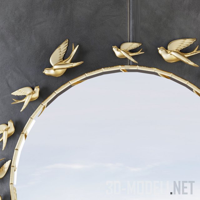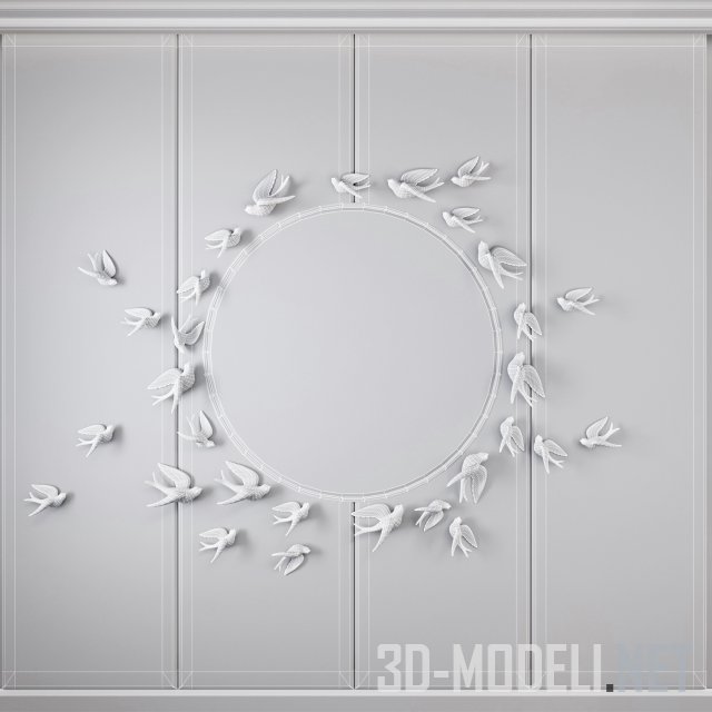 Комплексный декоративный элемент для отделки стены, включает в себя мягкие настенные панели, на которых отлично смотрится круглое зеркало в золотой оправе, и настенный декор «Чайки». Размер: 3200 x 3000 мм.
