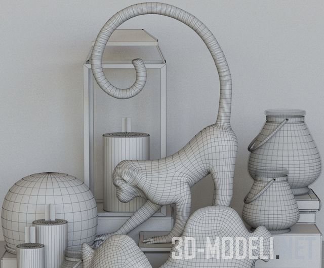 Набор декоративных предметов, в который входят две объемные стеклянные рыбки, медузы, толстые голубые и лимонного цвета свечи в больших стеклянных подсвечниках. Крупная фигурка обезьяны золотого цвета, с длинным хвостом, является акцентом набора.