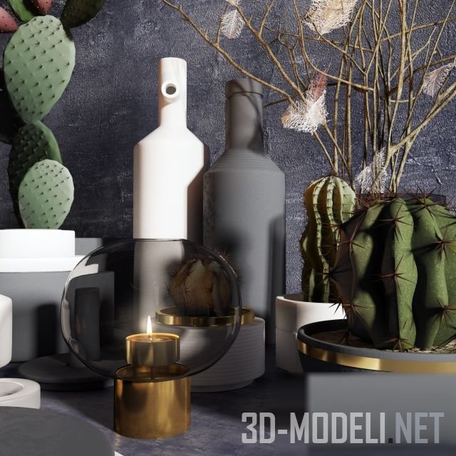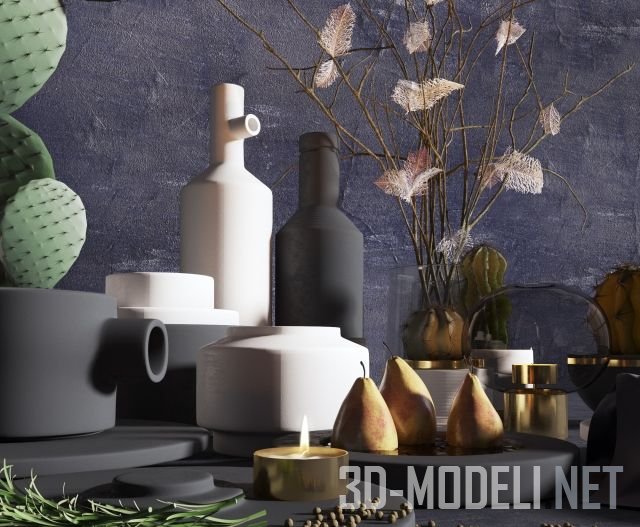 Набор аксессуаров с сухими ветками и редкими ажурными листьями на них, горящей свечой в плоском низком подсвечнике золотистого цвета и тремя крупными золотисто-розовыми грушами в большой плоской емкости графитового цвета. Зеленые кактусы и зеленые веточки розмарина, лежащие на большом матовом круге, подчеркивают футуристическую эстетику сета.