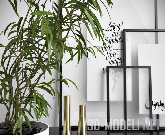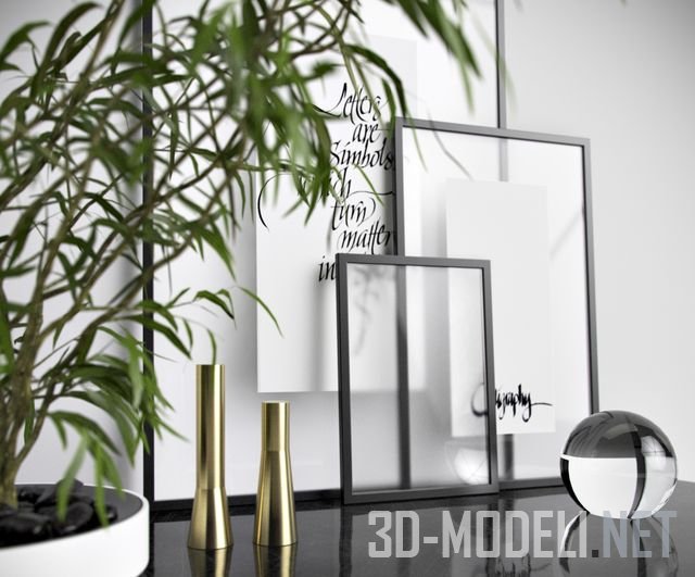 Набор элементов для украшения интерьера. На черной глянцевой поверхности консоли стоит в низком белом кашпо большой фикус али, две золотистые вазы, стеклянный шар на подставке и узкие черные рамки.