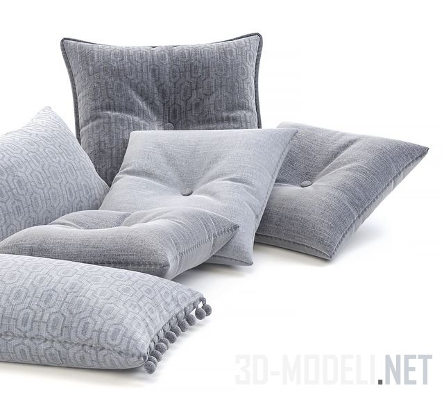 Набор диванных подушек светло-серого цвета и разнообразной формы. Комплект можно использовать разным способами: положить подушки на диван в гостиной, бросить живописной мягкой группой на большой круглый плетеный из ротанга диван в саду, декорировать кровать и пр.
