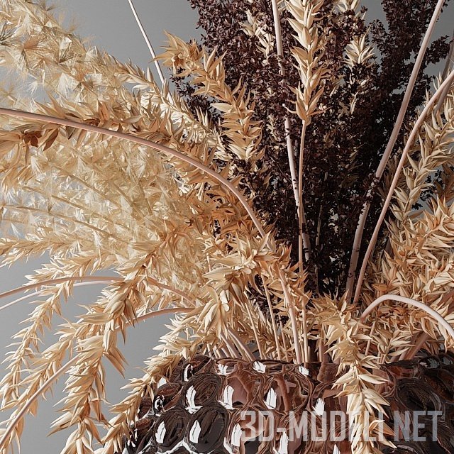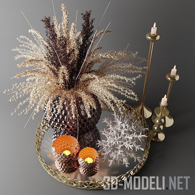 Бежево-коричневый шарообразной букет из сухих цветов в глянцевой стеклянной вазе с пупырчатыми стенками. Букет стоит на металлическом подносе с ажурным бортиком. Кроме него на подносе лежит белый коралл и стоят две маленькие пупырчатые вазочки. Три высоких латунных подсвечника дополняют композицию.