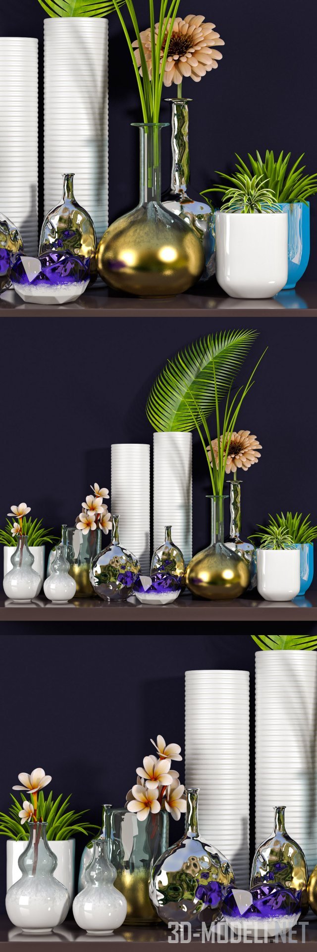 Декоративный сет с разнообразными вазами. Две высокие вертикальные белые с круговой ребристой насечкой. В одной из ваз стоит большой зеленый пальмовый лист. Несколько белых глянцевых горшков с зелеными цветами, три вазы с бежевыми цветами альстромерии и две пузатых вазы бронзового цвета с высоким узким горлышком. В одной из них стоит бежевая гербера, в другой узкие зеленые листья.