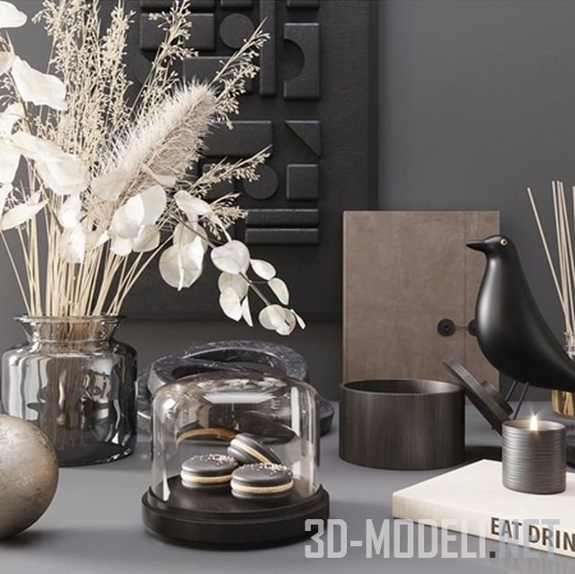 Стильный сет в черных тонах: на столе Cliff от Lambert & Fils стоит черная фигурка птицы Eames, стеклянная ваза с сухой травой, книги, деревянный ящик, стеклянная коробка с печеньем макарон, ноутбук, золотая сфера, мраморный круг, свеча.