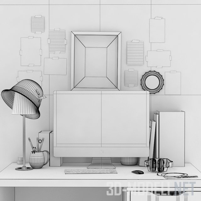 Набор декоративных аксессуаров для наполнения рабочего стола. В комплекте хорошо сочетаются между собой предметы техники (компьютер Apple и розовые наушники) и такие элементы, как картины и фотографии, книги и канцтовары. На абажур белой настольной лампы игриво надета черная шляпа.