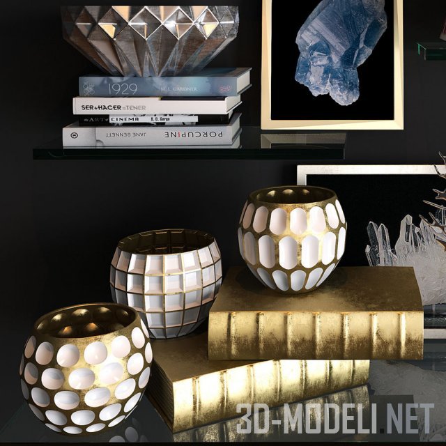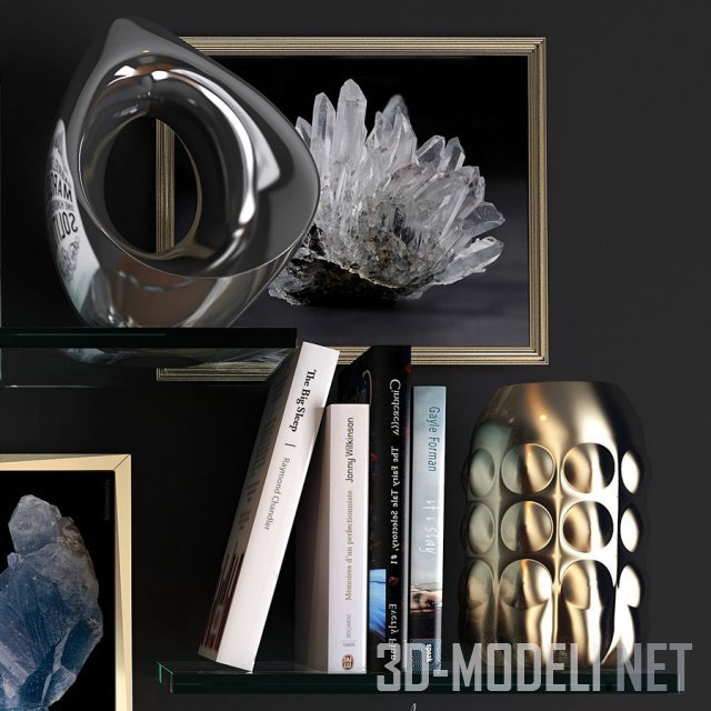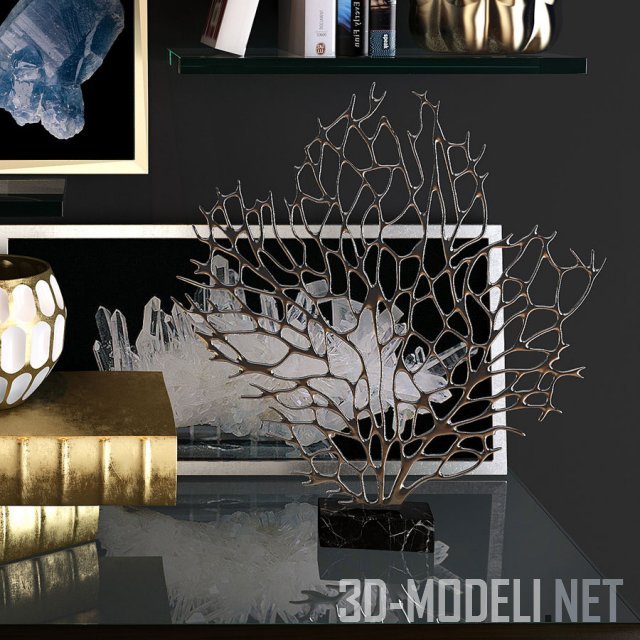 Толстые стеклянные полки служат отличной основой для интерьерных аксессуаров. Фотографии с кристаллами, рифленые вазы, книги, декоративные коралл и книги подобраны в едином стиле и цветовом решении, что смотрится очень гармонично и стильно.