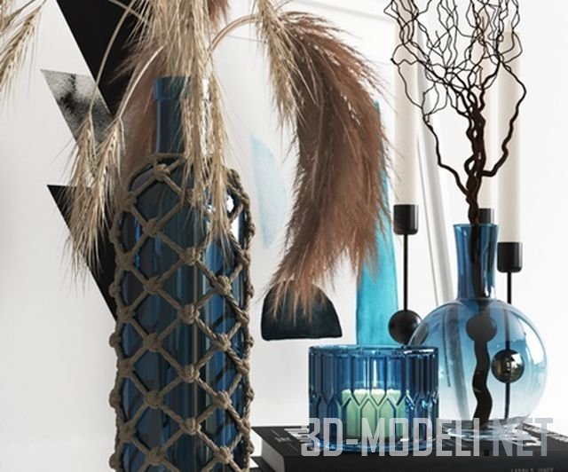 Набор декоративных элементов, в которых органично сочетаются цвета (голубой, коричневый) и материалы. Это веревка, оплетающая вазу, пампасная трава, собранная в пышный букет, вазы из голубого стекла, книги, подсвечники.