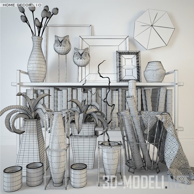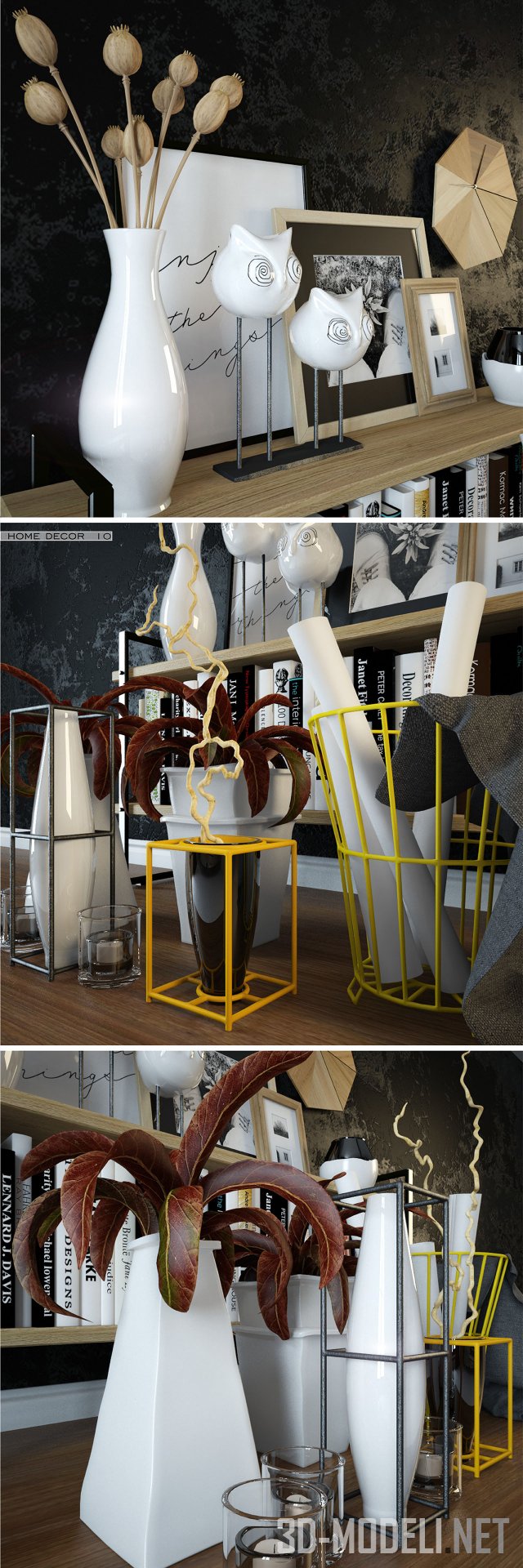 Набор аксессуаров для украшения интерьера. В комплекте ваза с сухими маками, постер, фоторамки, фигурки-«совы», настенные часы-зонт, ваза для яиц, керамические горшки с растениями, дизайнерские вазы с сухими ветками, корзина для бумаг, салфетки, стеклянные подсвечники, полки с книгами.
