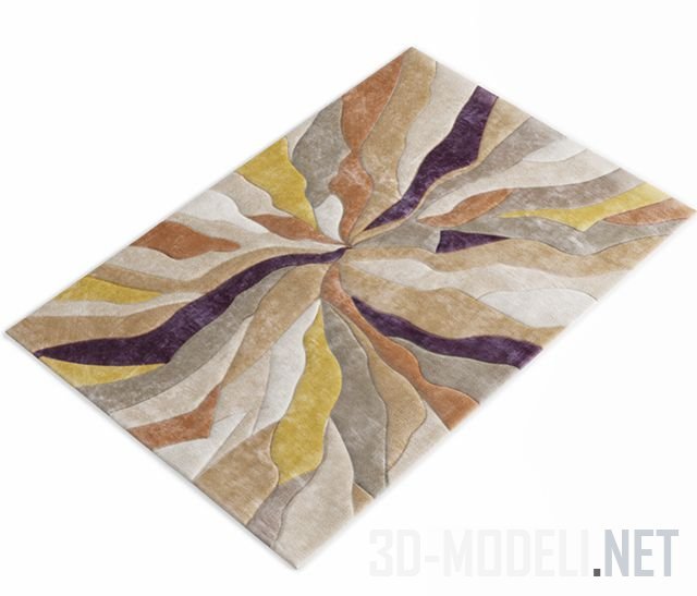 Современный прямоугольный ковер Ochre Rug от Infinite Splinter с доминирующим охристым тоном. Рисунок ковра представлен кривыми вытянутыми пятнами оттенков охры, серыми и фиолетовыми, желтоватыми. Пятна сходятся в одну точку на поле ковра.