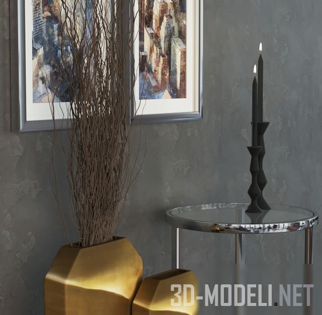 Набор для декорирования современного интерьера от Dome Deco. В комплекте с парой вертикальных картин с абстрактным городским пейзажем с белым паспарту и серебристыми рамками (45 х 105 см), двумя напольными золотистыми вазами (56 х 33 х 12 и 45 х 27 х 10 см) и столом (h55 х d50 см). Стол выполнен в виде двух хромированных колец, составляющих верхний и нижний торцы цилиндра и соединенных тремя вертикальными распорками. Круглая столешница изготовлена из стекла. На столике два черных матовых подсвечника со свечами. В одной из ваз помещен пучок волнистых сухих веток.