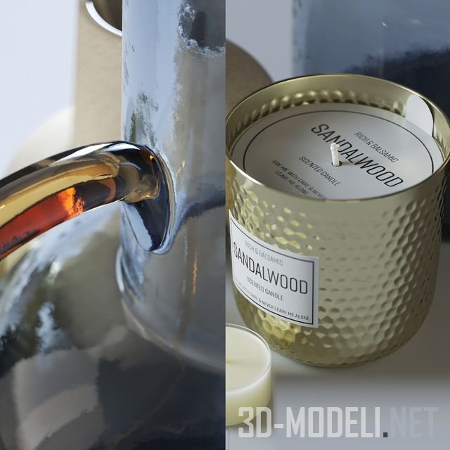 Набор декоративных элементов от брендов H&M и Zara Home. Содержит ароматы для дома, сухоцветы в керамической светлой вазе, стеклянный графин и свечи.