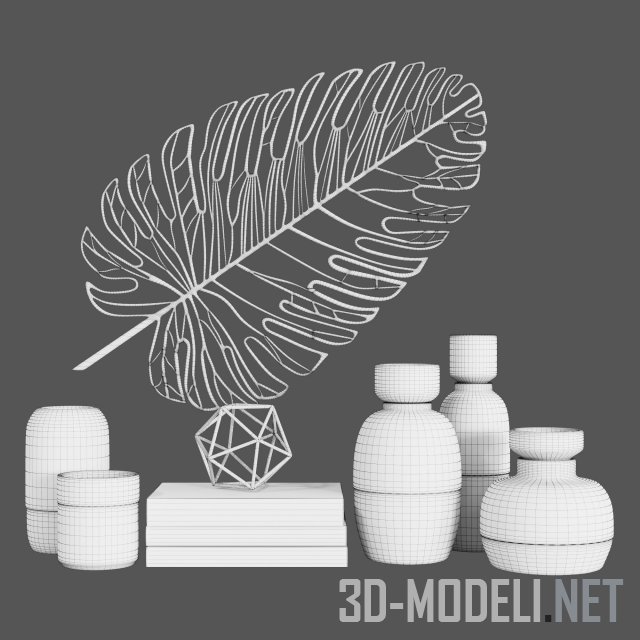 Элегантный сети для украшения поверхностей в интерьере. Содержит несколько ваз в комбинации золотой и темной (полосатой) отделки, книги Dior и Chanel. Акцентным элементом смотрится золотой ажурный лист в качестве настенной декорации.