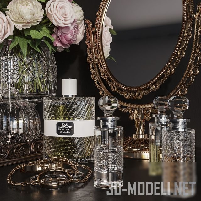 Шикарный сет для туалетного столика в интерьере классической дамской спальни. Настольное зеркало в фигурной узорчатой бронзовой раме гармонирует с подносом с вычурными краями. На подносе стоят два больших хрустальных флакона и большой букет белых и розовых пионовидных роз в хрустальной вазе. Возле зеркала стоят еще несколько хрустальных флаконов и лежит крупная золотая цепочка.