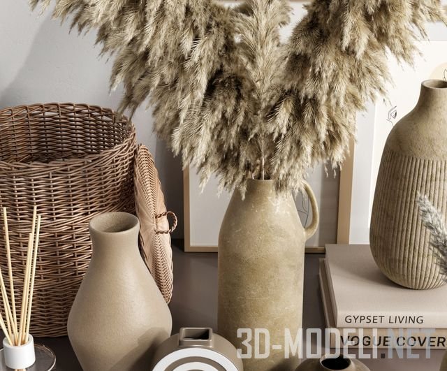 Набор декора в эко-стиле. Все элементы в спокойной цветовой гамме, что станет универсальной интерьерной базой. В центре композиции ваза с пампасной травой, несколько пустых ваз и вазочка с букетом поменьше гармонично вписываются в комплект. Книги, картины, плетеная корзина формируют удачный набор для украшения интерьера.