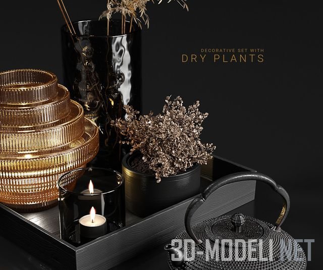 Эстетичный набор аксессуаров для декорирования интерьера. Содержит темную вазу с сухой травой в букете, маленький сухой букетик, а также стильный заварочный чайник. Элементы золотистого цвета вносят праздничный акцент.