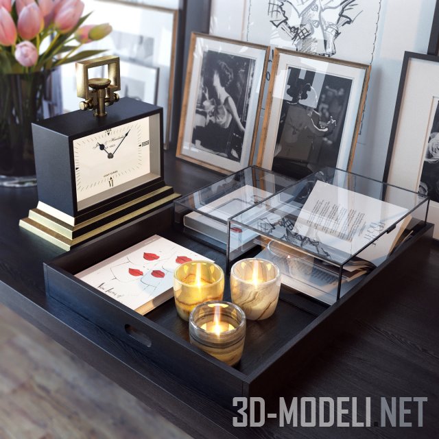 Набор декоративных элементов для современного интерьера. Большой букет розовых тюльпанов в прозрачной вазе, книги, свечи в стаканах-подсвечниках и настольные часы с золотистым декором. Восемь различных черно-белых картин и фотографий дополняют сет.