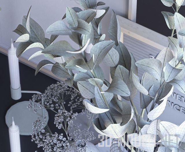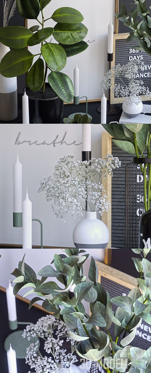 Декоративный набор для элегантного пространства, собран из предметов в эстетичной цветовой гамме. Это минималистичные постеры в простых деревянных рамах, вазы, белые свечи и растения: фикус в горшке и ветки эвкалипта в серо-белой вазе.