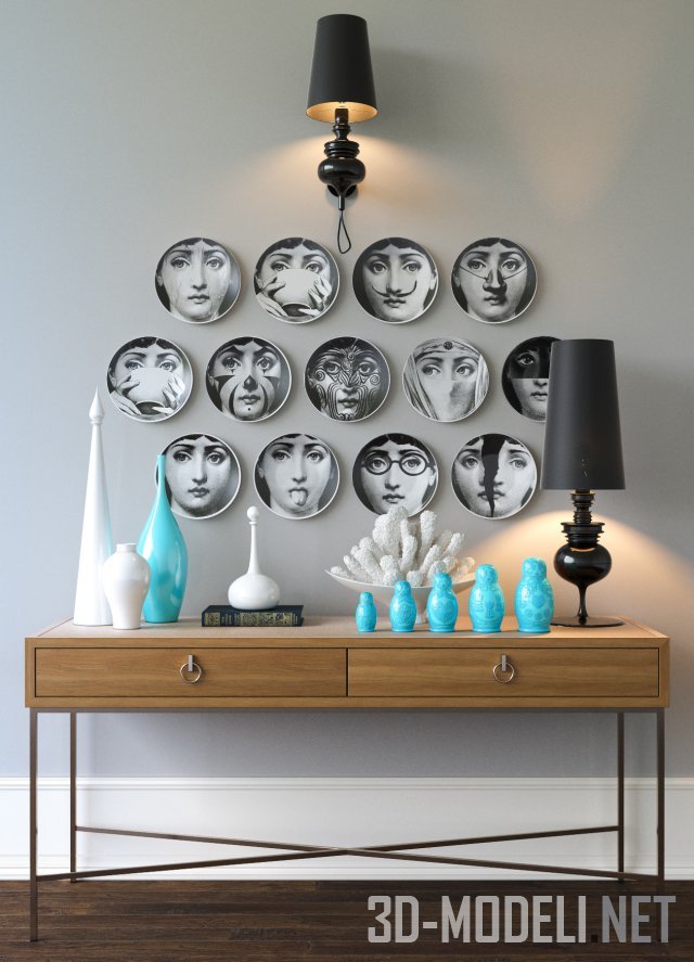 Интерьерный набор в черно-бело-голубом сочетании. Консольный столик с парой выдвижных ящиков, на металлическом каркасе. На столике - набор матрешек нежно-голубого цвета. В цвет матрешек подобрана изящная ваза. Она - в наборе с белыми вазами разного размера и формы. Пара шикарных светильников черного цвета (настольный и настенный) гармонично вписываются в общий ансамбль. Фоном композиции служат тарелки Fornasetti с черно-белыми женскими портретами.