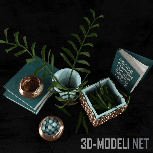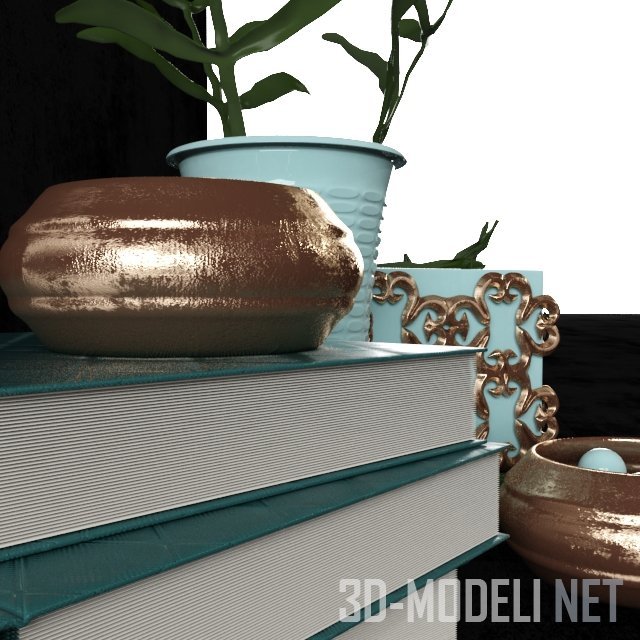 Несколько предметов интерьера, подобранных в очень приятном сочетании светло-коричневой глянцевой керамики и бледно-бирюзового цвета. В наборе: цветочные горшки, невысокие круглые пепельницы из светло-коричневой керамики, книги в обложках цвета темной морской волны. Зелень растений обогащает и дополняет красивую цветовую гамму.