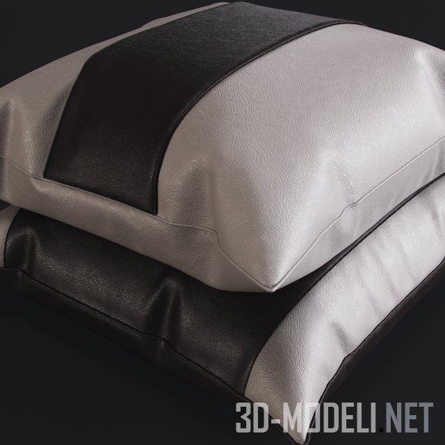 Две декоративные диванные подушки в кожаных чехлах. Чехлы выполнены из двух цветов кожи: светло-бежевого и черно-коричневого. Соотношения цвета разное. На одной подушке доминирует светлый, на второй темный цвет кожи.