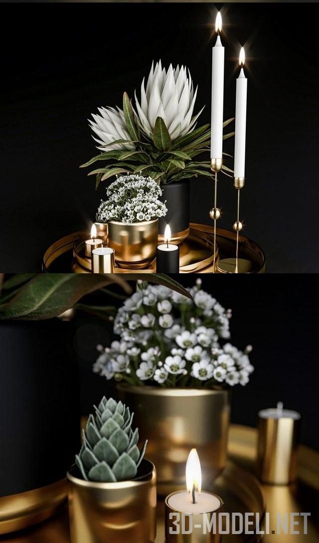Декоративный набор из 10 предметов, в который входят свечи в высоких подсвечниках, три свечи в золотых подсвечниках, пиалы, три растения в горшках, два подноса разного диаметра.