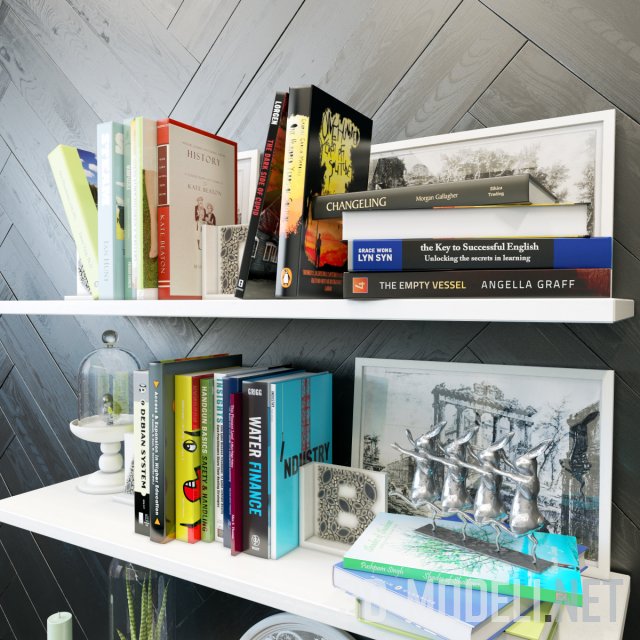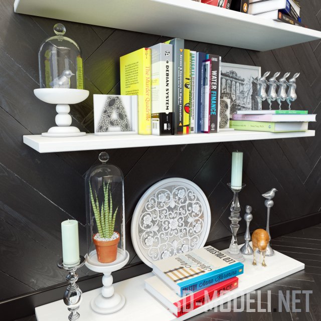 Декоративный набор для интерьера, полки белого цвета с множеством предметов. В основном это книги, также присутствуют гравюры, ажурная тарелка, свечи, растения в колбах и другие аксессуары.