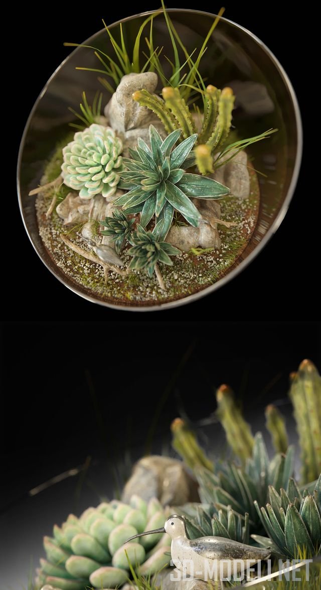 Элемент для декорирования интерьера, флорариум. В композиции присутствуют каменная роза, эхеверия, агава, кактус, стапелия, а также декоративная птичка.