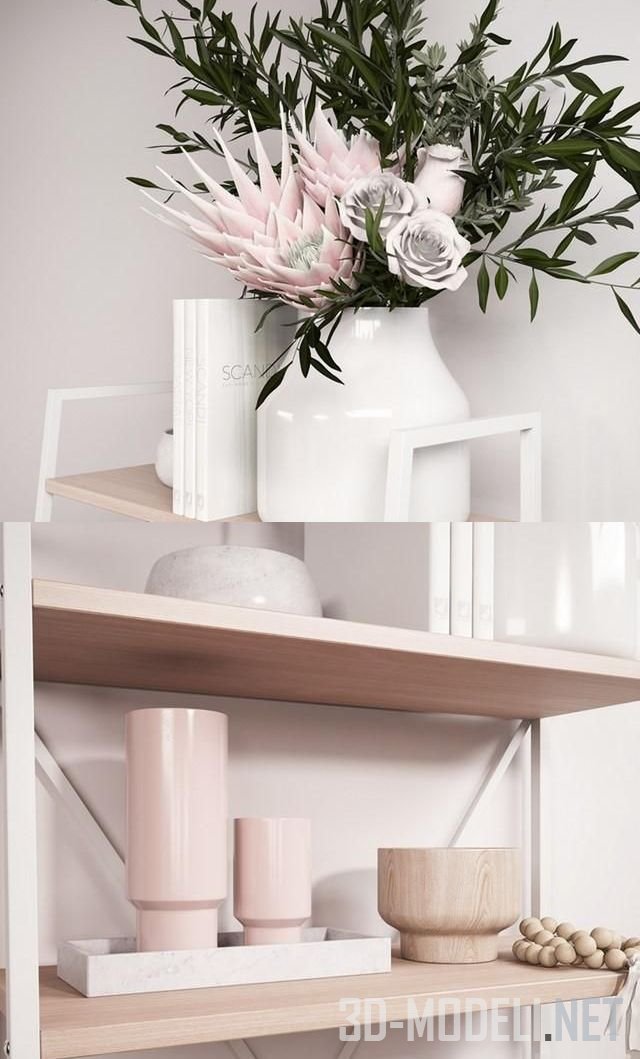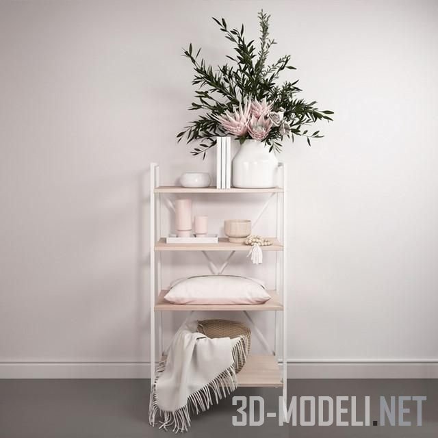 Нежный декоративный набор для интерьера в скандинавском стиле. Легкая этажерка уставлена предметами декора, на верхней полке стоит букет из протеи и роз.