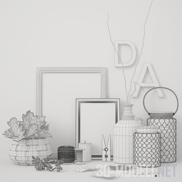 Красивый, немного грустный осенний декор с двумя светильниками из черной сетки, за которой просматриваются белые свечи. Два черных постера, бутылка с голыми ветками и осенние листья в плетеной коричневой вазе дополняют сет.