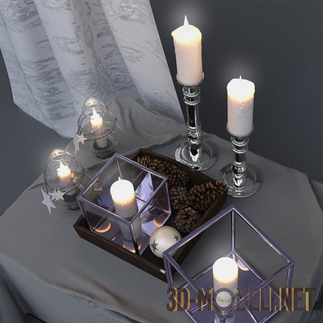 3D-модель праздничной декоративной композиции, состоящей из подсвечников, свечей, шишек и других элементов. Набор с успехом может быть использован как для новогоднего декора, так и для создания романтической атмосферы в повседневном интерьере. Все текстуры в архиве.
