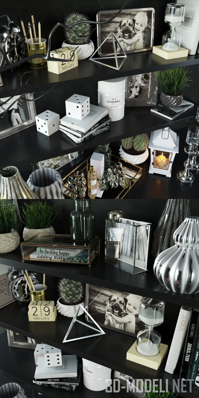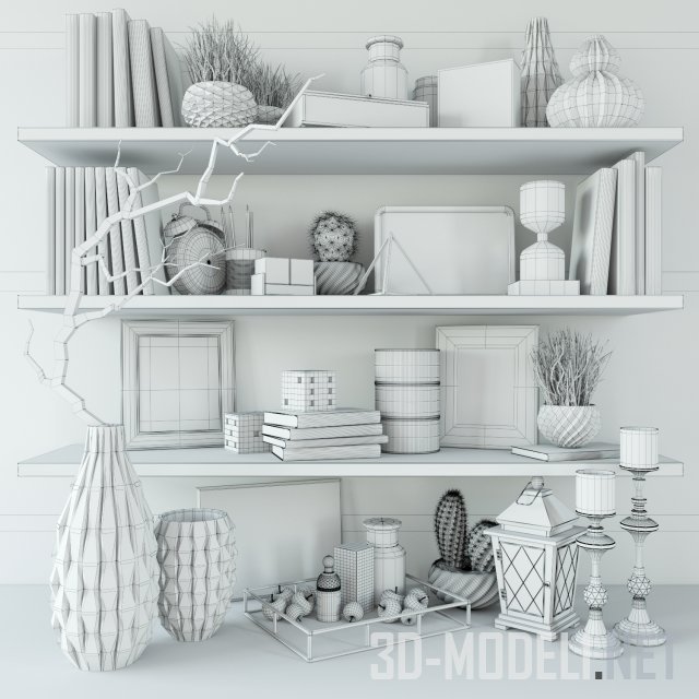 Набор разнообразных предметов для декора интерьера: лежащие и стоящие на полках книги, горшочки с кактусами, часы, фотографии в рамках, большая ваза с черной крупной веткой и подсвечники.