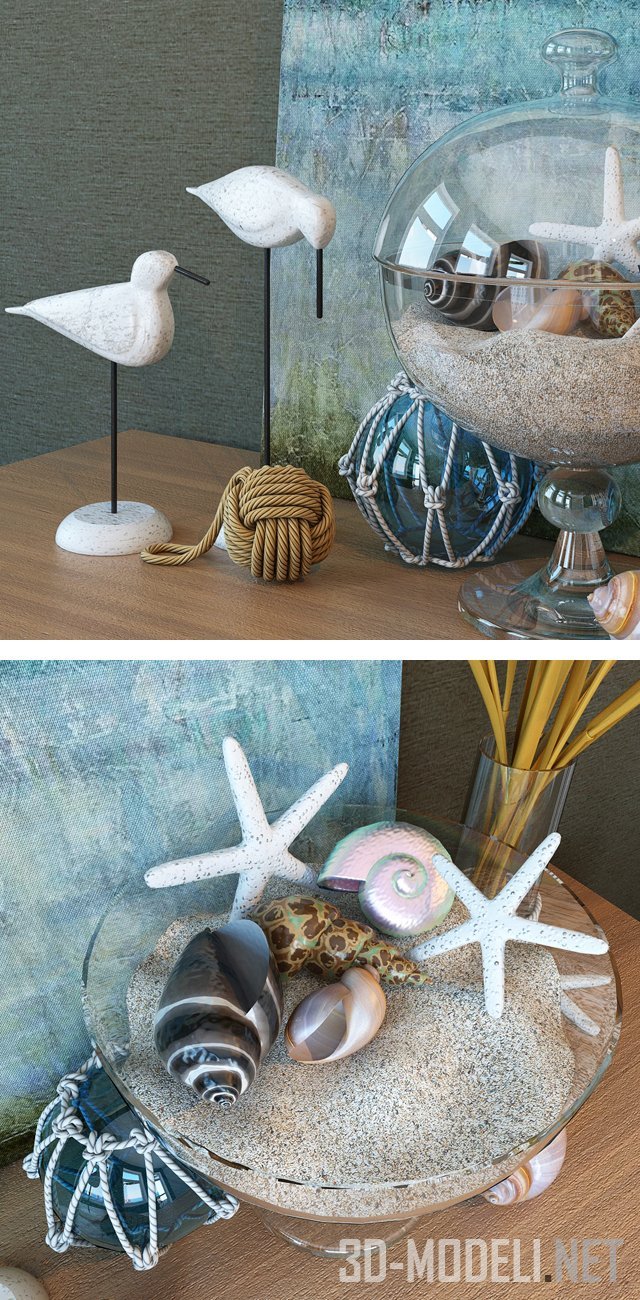 Красивый набор декоративных аксессуаров (в стиле Coastal) для оформления современного интерьера. На фоне большой абстрактной картины в бело-голубой цветовой гамме стоит большая круглая стеклянная колба с раковинами и морскими звездами внутри. Две статуэтки белых птиц и высокая стеклянная ваза с желтыми колосками дополняют композицию.