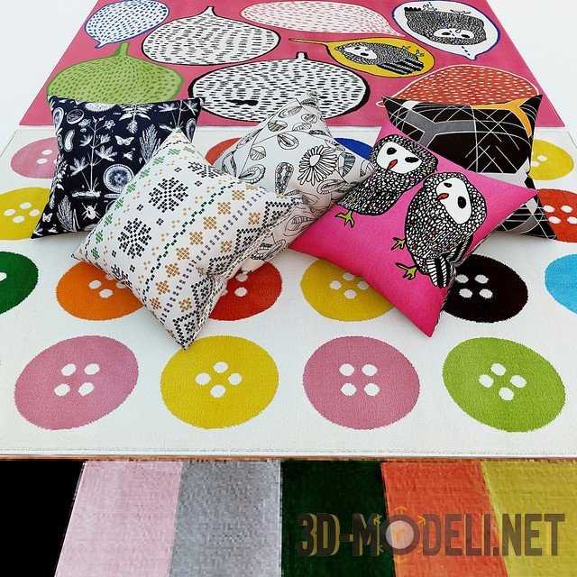 3d-модель современных подушек и ковров от бренда IKEA. В коллекцию входят ковры размером 133х195см: «РАНДЕРУП» 102.836.78, «ТОСТРУП» 702.517.40, «ГУЛЭРТ» 802.501.89, и подушки 50х50см: «ПИПОРТ» 202.863.89, «СНАББВИНГЕ» 702.718.99, «БЛОВИНГЕ» 102.810.85, «БЬЁРНЛУКА ФИГУР» 802.827.55, «ГУЛЭРТ» 302.811.31. Модель со всеми текстурами в архиве.
