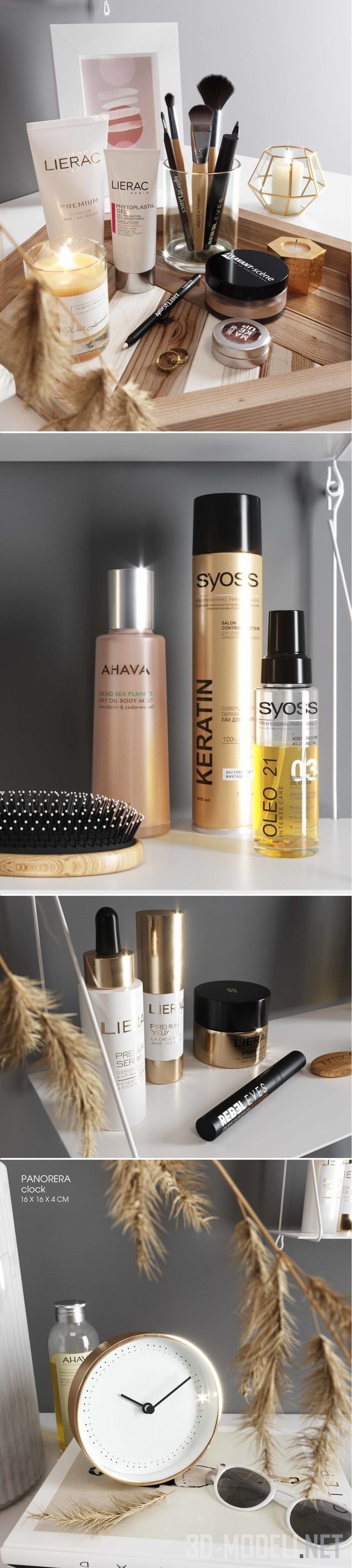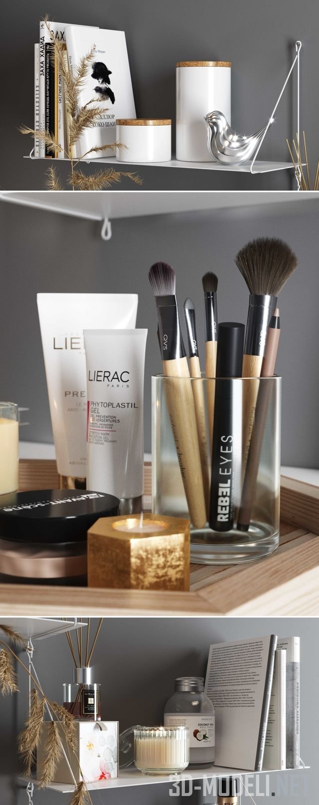 Декоративный набор для украшения интерьера, содержит множество предметов. Это деревянный поднос с косметикой, ваза с веткой сухостоя и книги, часы, а также полки. На них можно расставить ароматы для дома, книги, косметику и пр.