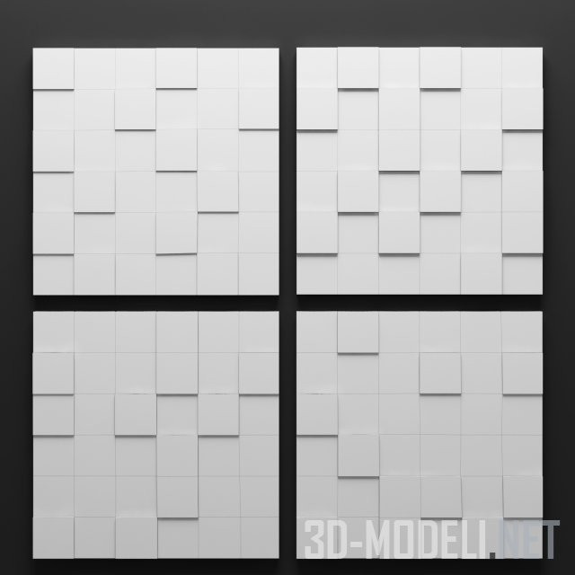 Четыре варианта квадратных декоративных панелей. Плоскости панелей набраны из квадратных спилов с бруса и собранных с разной направленностью текстуры и разной толщины составляющих элементов мозаики. Варианты тонировки панелей с текстурой древесины дуба: белый, не тонированный (натуральный), темно-коричневый (венге) и рыжевато-желтый.