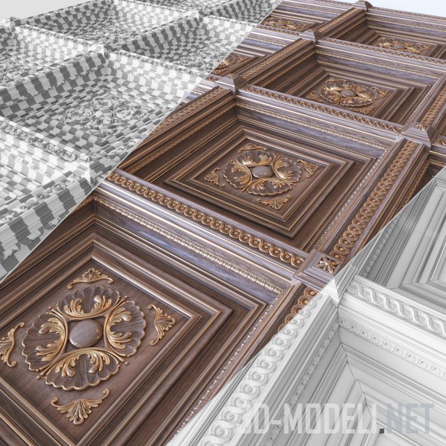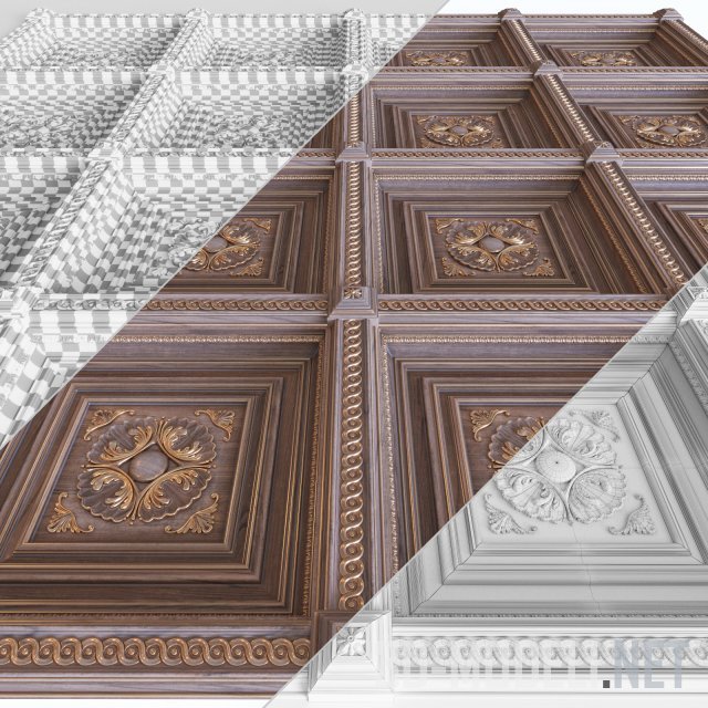Деревянный кессонный потолок с резными розетками в центре квадратных секций и многоуровневыми багетными рамками вокруг них. Основной тон дерева орех. Патинирование золотом. Габарит одного кессона: 1329 х 1329 х 219 мм.