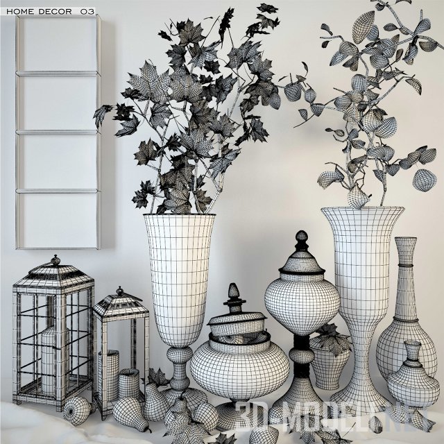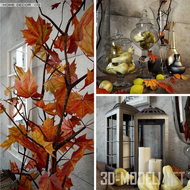 Декоративный набор для украшения интерьера. Сет содержит картинки в рамах, фонари декоративные со свечами, вазы с сухими ветками, кувшины, а также фрукты (груши, лимоны).