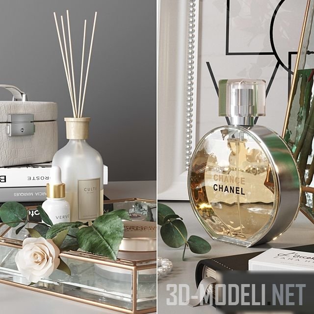 Изящный декоративный набор для туалетного столика: стеклянный поднос, в котором лежит ветка розы, белые жемчужные бусы, кольцо, пудра, тени: серебристые ажурные основания стеклянных подсвечников с мерцающими в них свечами. В сцене также есть  спички, книги, белый конверт, блокнот, духи, туалетная вода и красивый букет белых роз в стеклянной вазе.